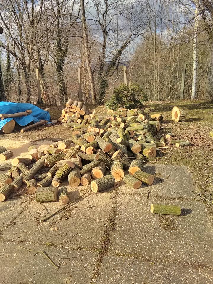 Wir häckseln Schnittgut direkt vor Ort und hinterlassen saubere Flächen. Stammholz schneiden wir auf Wunsch ofenfertig zu. Entsorgung fachgerecht – alternativ liefern wir das Häckselgut als Mulch.